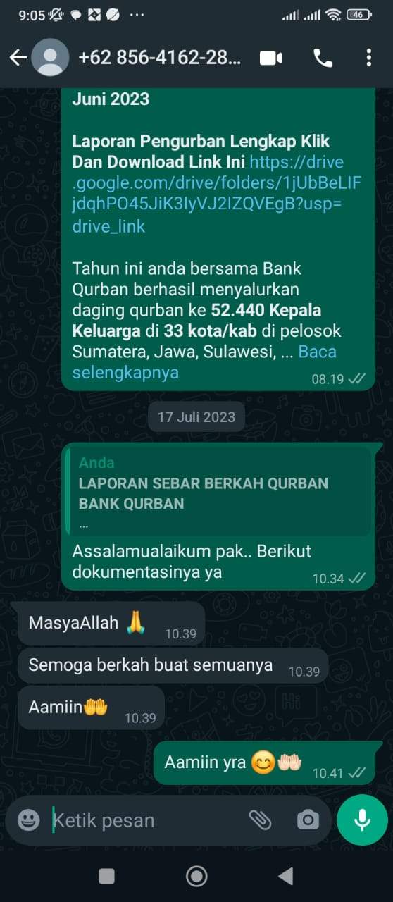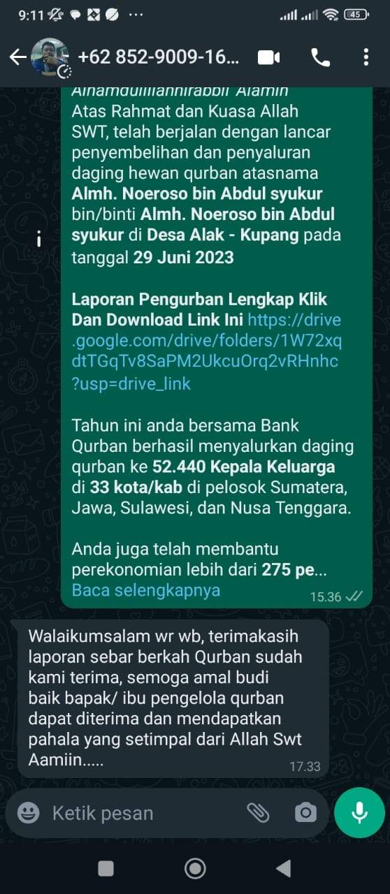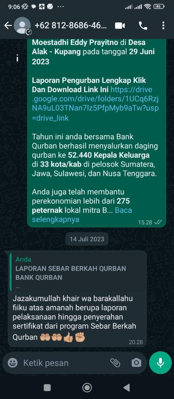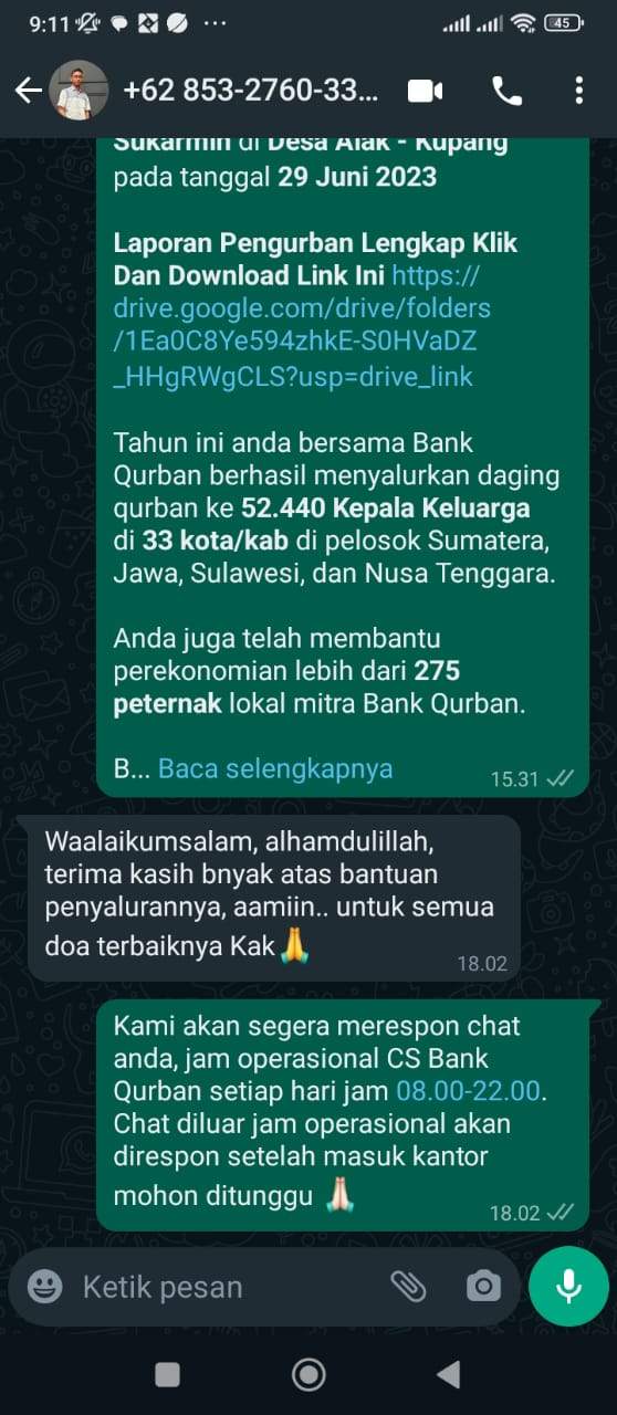 Tetapi bertepatan di hari H Idul adha dan Tasyrik akan ada notifikasi dari CS Qurban via whatsapp menginformasikan kalau hewan qurban bapak/ibu sudah kami sembelih.